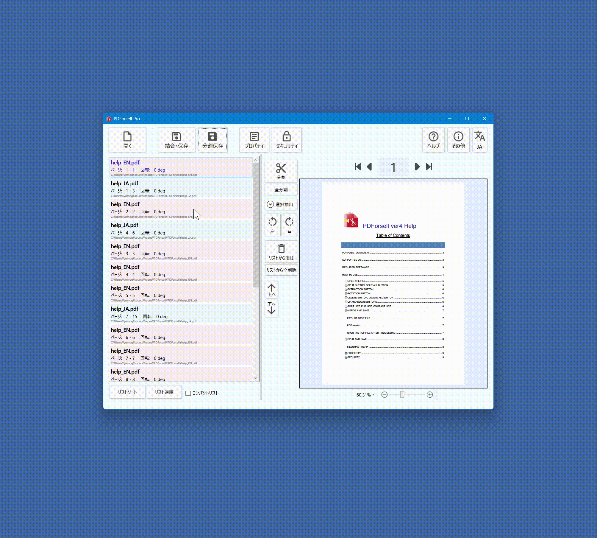 「PDForsell」は保存方法がいろいろ!PDForsellは"結合保存"だけでなく"分けて保存"も可能。“結合・保存"すると、リストの通りに結合した1つのPDFファイルが生成“分割保存"ではリストの数だけPDFファイルが生成されるページの間に他のファイルのページを挿入したり削除したり可能で、そのまま保存できるPDForsellを見る他の記事PDF編集の決定版「PDForsell」のご紹介「PDForsell」はファイルの中身を見ながら編集できる!「PDForsell」はページ編集が楽!